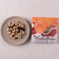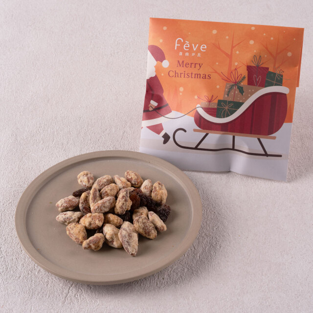香ばしくローストした皮付きのアーモンドにメープルシュガーをたっぷりコーティングしました。爽やかな香りと酸味のサルタナレーズンを添えて。