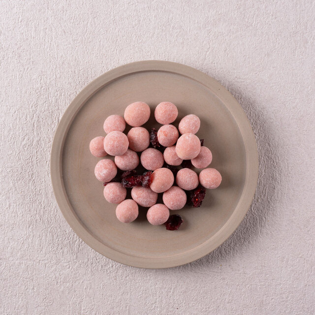 軽い食感の落花生を苺パウダーでコーティングし、ミルクパウダーでまろやかに仕上げました。ドライクランベリーを添えています。