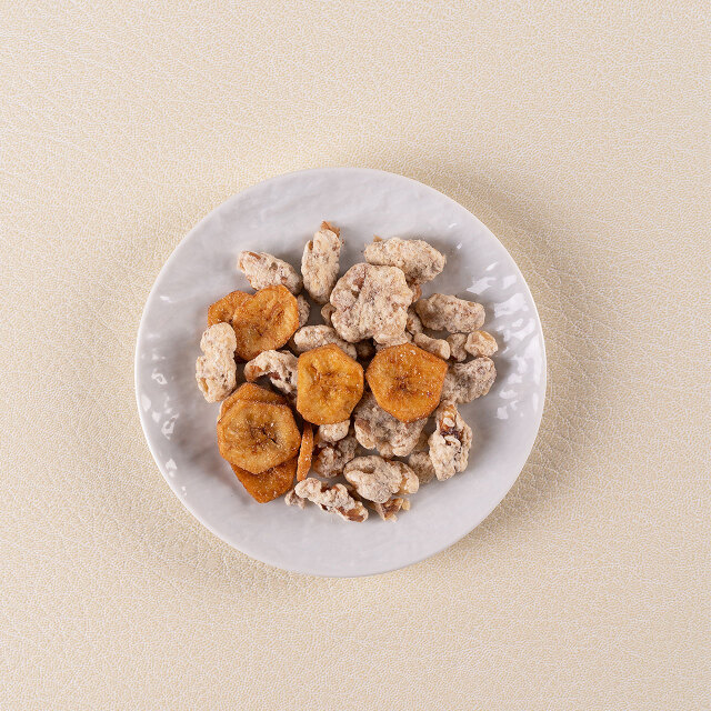 黒糖を絡めたコクのある味わいのバナナチップを添えています。