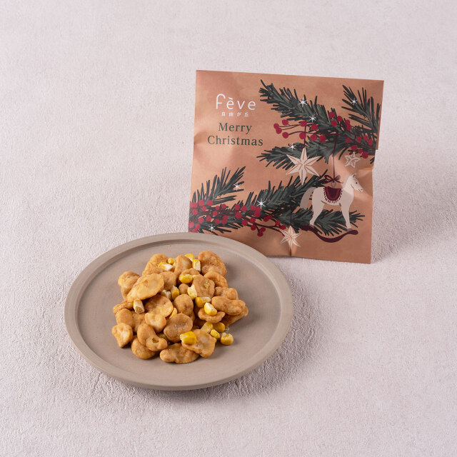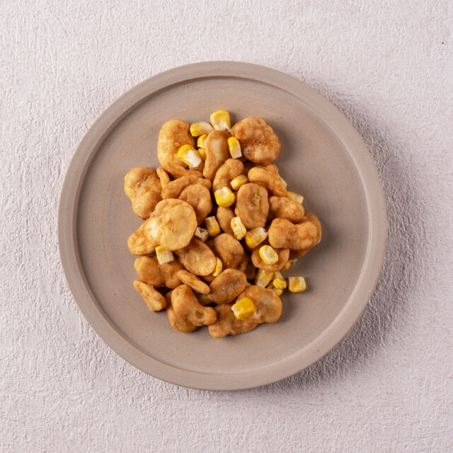 焦がし醤油が食欲をそそる、焼きモロコシをイメージしたそら豆です。フリーズドライの甘いとうもろこしをミックスしています。